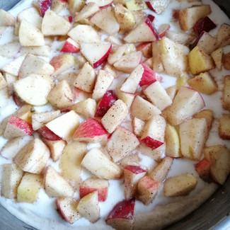 Pagatavošana: 1. Uzkarsē krāsni līdz 190 grādiem, un sagatavo 24cm apaļo kūkas formu. Izklāj to ar cepamo papīru, formas maliņas iezied ar sviestu. 2. Sagriez ābolus nelielos gabaliņos (teikšu godīgi, es mēdzu nemizot, ja tie ir pašu lauku āboli, bet droši vari nomizot.) 3. Sajauc olas ar kefīru, pievieno miltus, cepamo pulveri - samaisi līdz izveidojas mīkla. Ielej to formā. 4. Ābolus sajauc ar 30g cukuru, rozīnēm un kanēli, pierīvē mazliet muskatrieksta. Pārber pāri mīklai. Nedaudz iespied ābolīšus dziļāk mīklā. 5. Jogurtu sajauc ar otru daļu cukura un pārlej pāri āboliem. Atceries - vari darīt arī otrādi - jogurtu uzlej mīklai uzreiz, un tad kārto ābolus. Šajā reizē es jogurtu uzlēju cepšanas beigu fāzē, 15min pirms beigām. 6. Cep apmēram 40-45 min, vai kamēr šķiet, ka ābolīši gatavi un